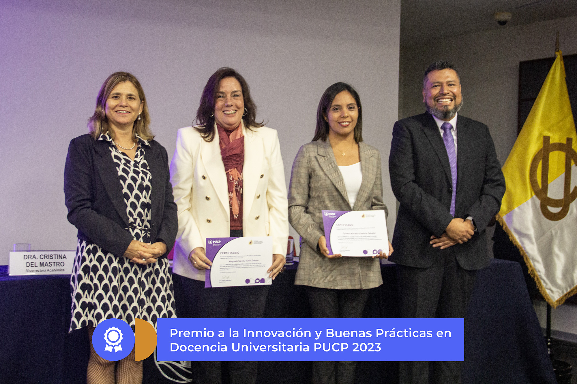 El día 13 de julio se realizó la ceremonia de premiación a la Innovación y Buenas Prácticas en Docencia Universitaria PUCP 2023. Ambas docentes recibieron su reconocimiento luego de la visualización de videos sobre sus experiencias docentes ganadores.